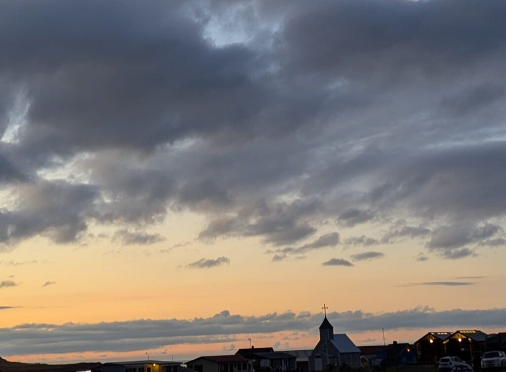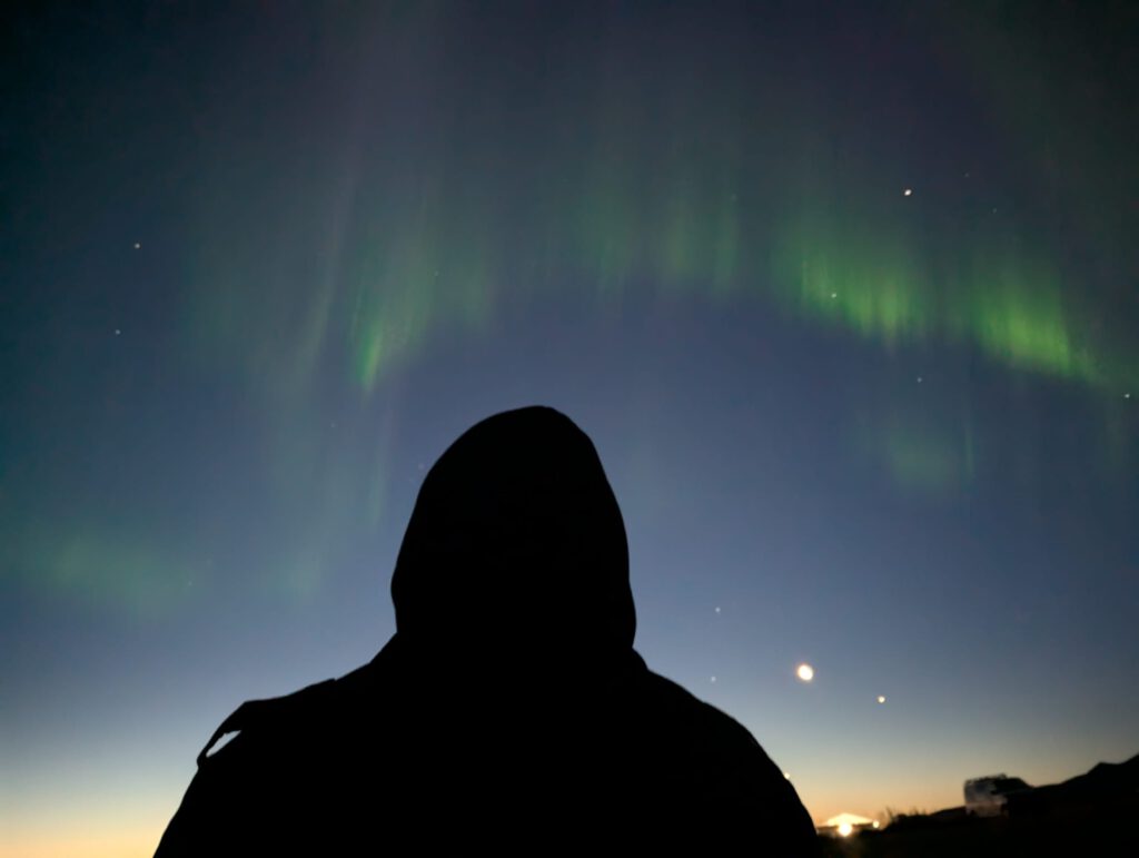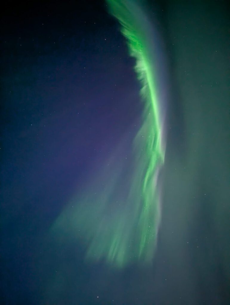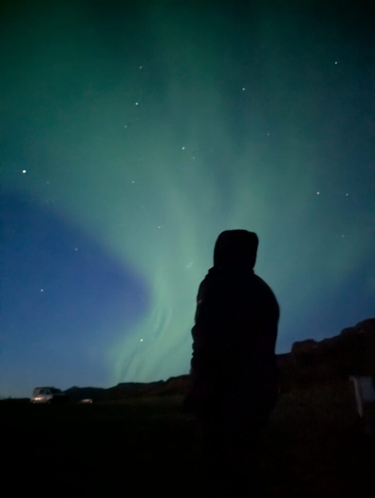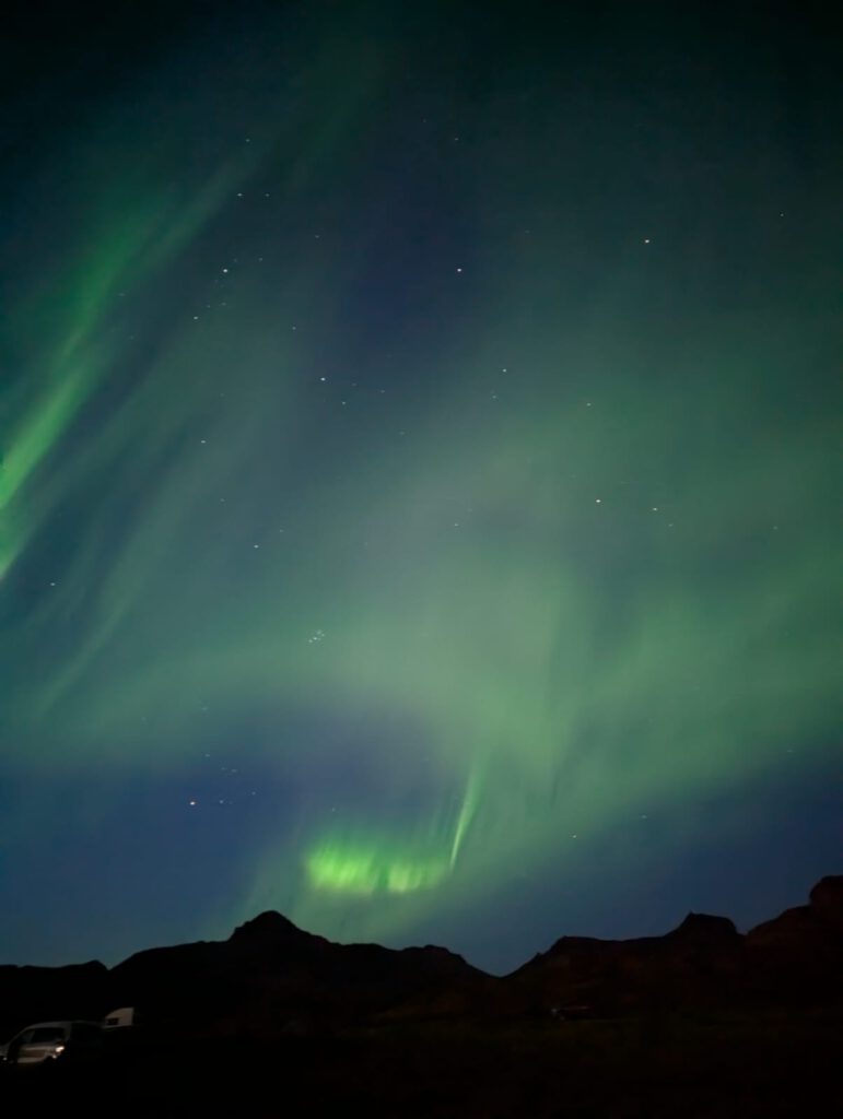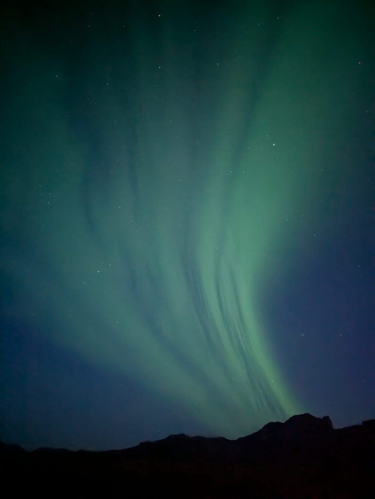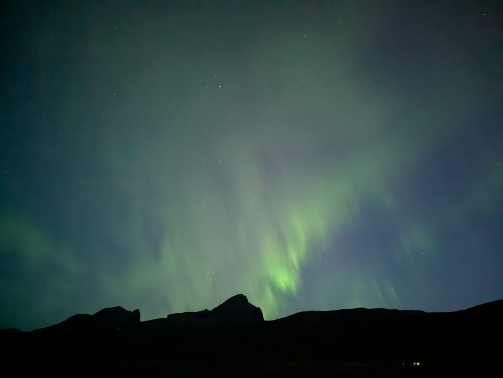 Zurück auf dem Campingplatz erklimmt Silke den Elfenberg, spürt die dortige mystische Atmosphäre und genießt den Sonnenuntergang über der Landschaft. Die Nacht wird kalt und sternenklar. Um 1 Uhr nachts spürt Silke, dass sie das Zelt verlassen und nachsehen muss, ob sich die Nordlichter zeigen. Sie entdeckt einen gigantischen, weißen Schleier am Himmel, weckt Jürgen und wir wissen sofort: Die Nordlichter beginnen. Eine Stunde lang stehen wir in der eisigen Kälte, bewundern das tanzende Licht am Himmel und sind voller Dankbarkeit, dass wir dieses magische Schauspiel erleben dürfen.