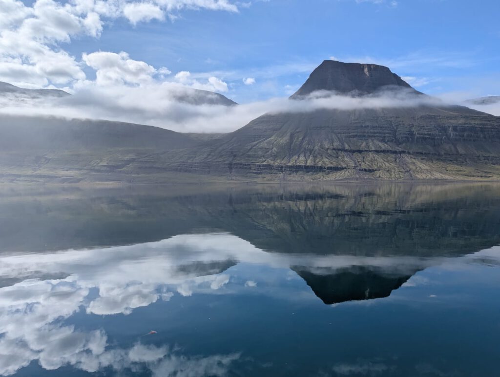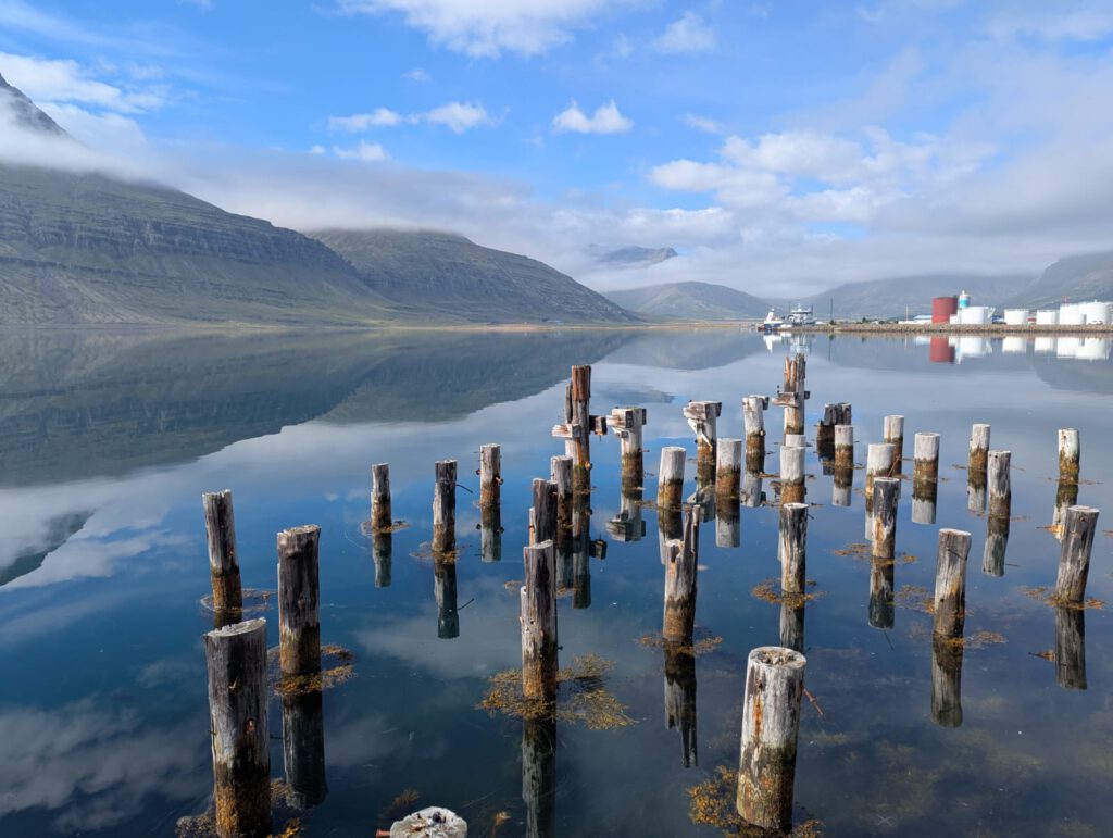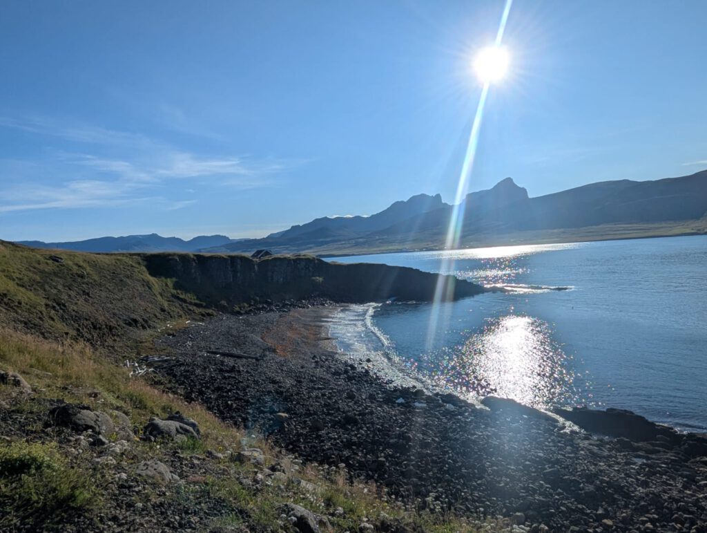 Wir wachen früh auf und führen unsere Reise gut gelaunt hinunter ins Tal fort. Schon jetzt sind wir überwältigt und fragen uns, wie jeder Tag in Island nur immer wieder eine neue, ganz eigene Schönheit bereithalten kann. Die Sonne scheint, die Luft ist ruhig und das Tal empfängt uns in vollkommener Windstille. Am Steg im Fjord von Renaðsfjörður werden wir Zeugen einer zauberhaften Szene: Wolkenschleier hängen in den Bergen, die Sonne tanzt auf dem Wasser, und wir sehen tatsächlich Feuerquallen, die anmutig, fast episch durchs Wasser gleiten. Wir sind voller Ehrfurcht und spüren inmitten dieser Magie auf einmal, wie sehr wir unser Zuhause und unsere Lieben vermissen. Besonders Jürgen spürt an diesem Ort das Band nach Zuhause sehr stark, da er vor einigen Jahren genau hier bereits einmal mit seinen Kindern war. So haben wir beide das Gefühl, als würden wir nicht nur zu zweit hier sitzen, sondern gemeinsam mit unseren Kindern, die gedanklich den Moment mit uns teilen.